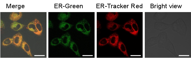 ER-Green是生光生物科技公司通過對對文獻報道內(nèi)質(zhì)網(wǎng)探針進行結(jié)構(gòu)修飾與優(yōu)化,篩選得到的一類高選擇性內(nèi)質(zhì)網(wǎng)定位綠色熒光探針。ER-Green可以用于活細胞內(nèi)質(zhì)網(wǎng)特異性熒光染色。與商業(yè)化 ER-Tracker Red 等探針相比,ER-Green熒光強度強,細胞毒性低,光穩(wěn)定性強。ER-Green在活細胞內(nèi)持續(xù)時間長,可以和其它探針實現(xiàn)聯(lián)合使用。
